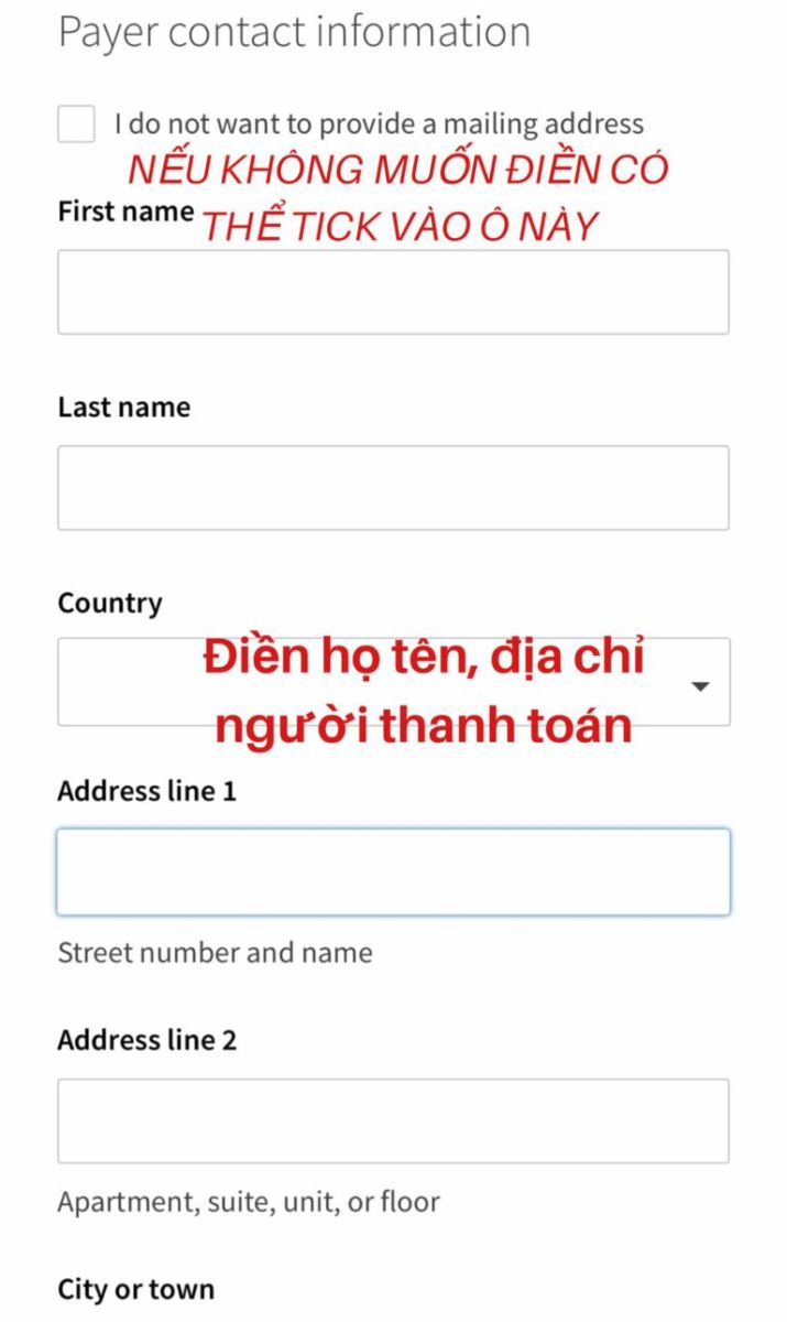 Điền địa chỉ của người thanh toán (Việt Nam hay Mỹ) đều được, và có thể bất cứ là địa chỉ nào, miễn là của người thanh toán.