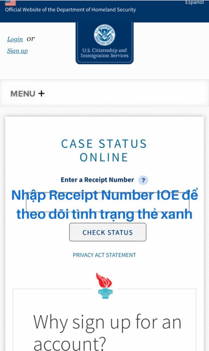 Nhập Receipt Number (IOE...) để kiểm tra tình trạng thẻ xanh